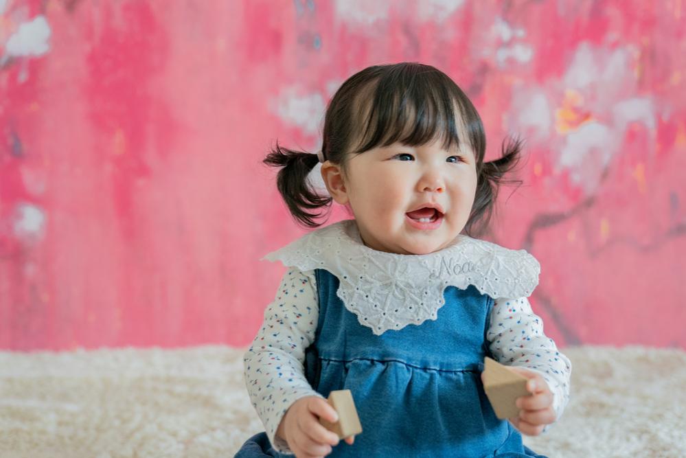 最初に撮影したのは「お子様おひとりカット」。花柄があしらわれた可愛い背景で撮影しました! 途中お子様が泣いてしまう場面もありましたが、おもちゃで遊んだり休憩をはさみながらお子様のペースに合わせて、ゆったりまったりリラックスして撮影ができました。 おかげで笑顔を見せてくれる瞬間も…! ピンクの背景にぴったりの可愛いお写真が撮れました◎