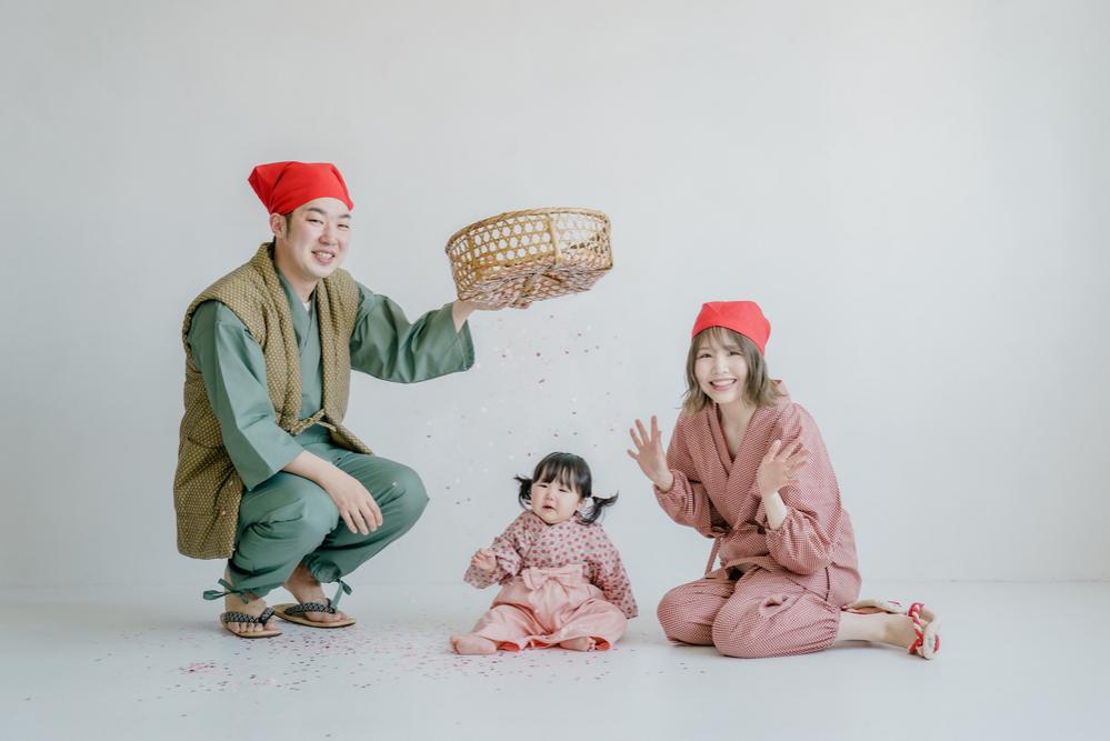 続いて撮影したのは花咲か爺さんをコンセプトにしたお写真。 この日は、スタジオでパパ、ママの衣装を用意していたのですが… なんと……!!!お子様の衣装は、お客さまご自身で用意していてくれていました!! スタジオで用意したパパママの衣装と合っているだけでなく、桜のピンクともピッタリの素敵なご衣装でした!