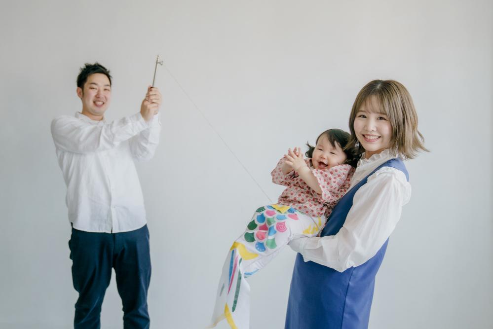 最後は鯉のぼりになったお子様をパパが釣り上げているようなお写真。 普段は撮影しないような、構図や面白いコンセプトで撮影ができるのもイベントやフォトスタジオでの撮影の醍醐味です。 思い出に残ること間違いなし!の一枚が撮れました◎
