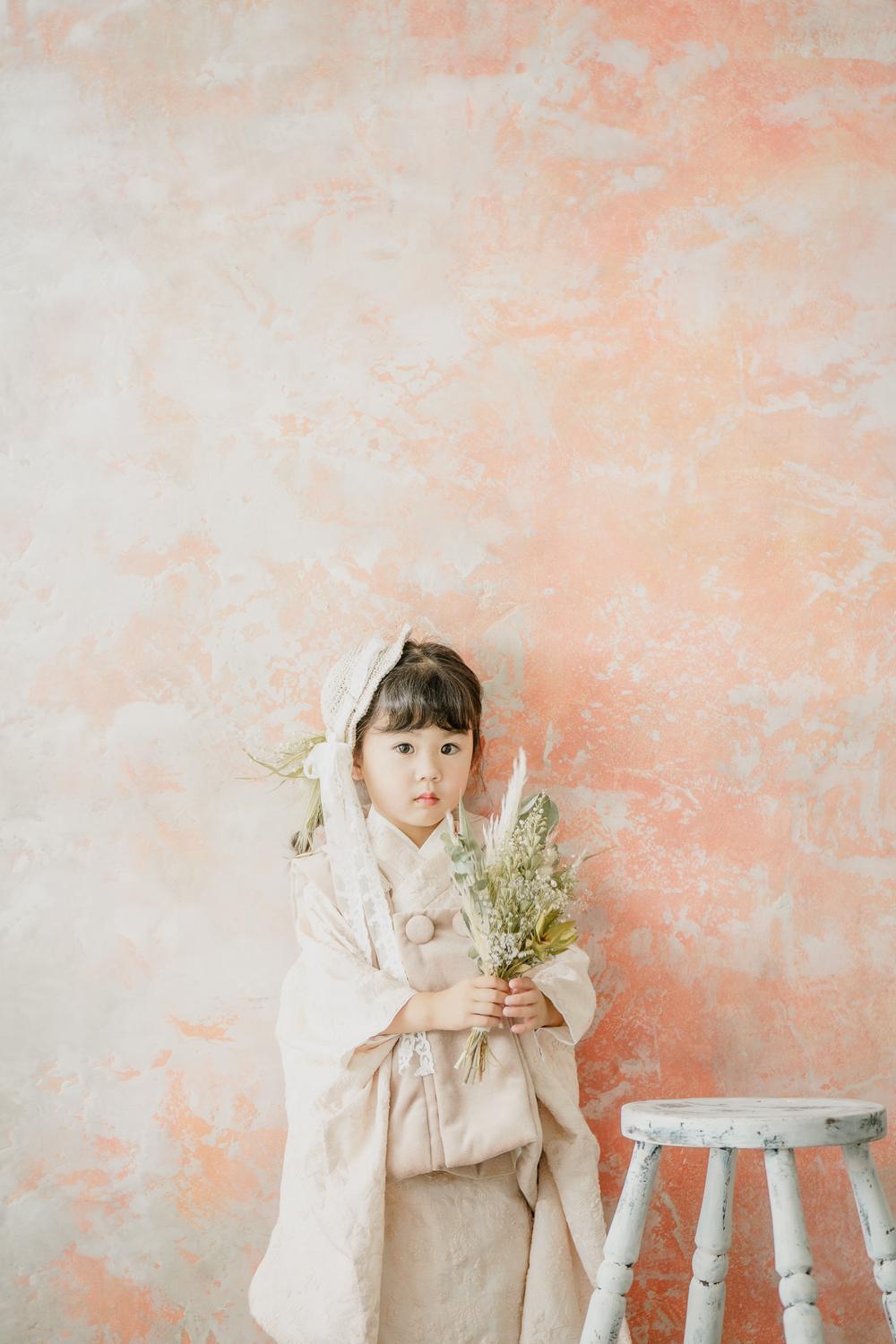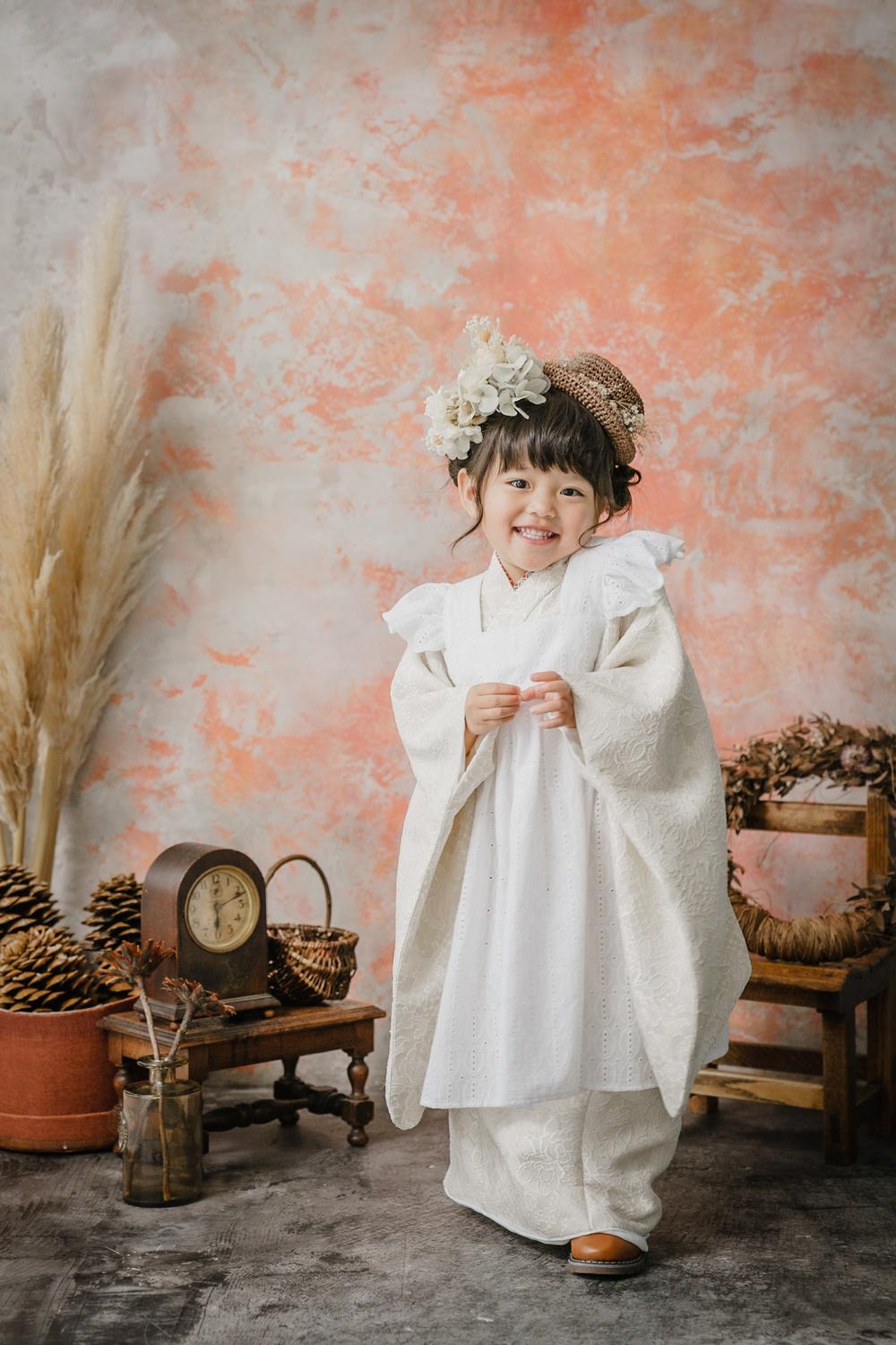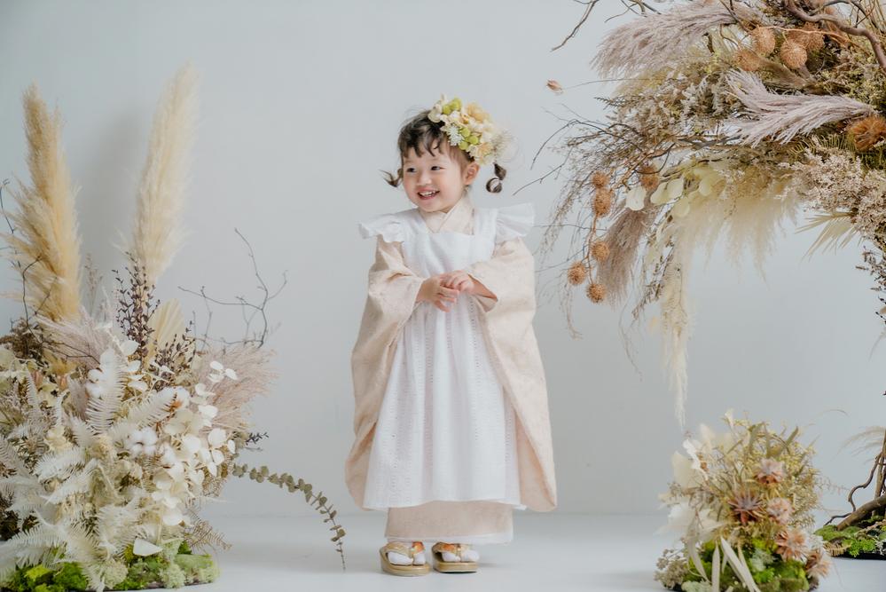 最後は真っ白のジャガード生地を使用したお着物!エプロン被布と合わせると真っ白で綺麗な印象に。柔らかい雰囲気が出るので、ちょっと大人っぽいお写真にしたいなという方におすすめです!こちらもシンプルながら、撮影すると陰影があらわれて素敵なお写真になりますよ◎