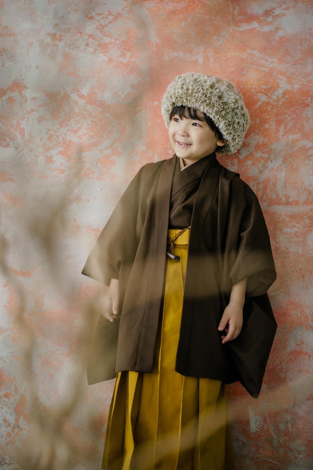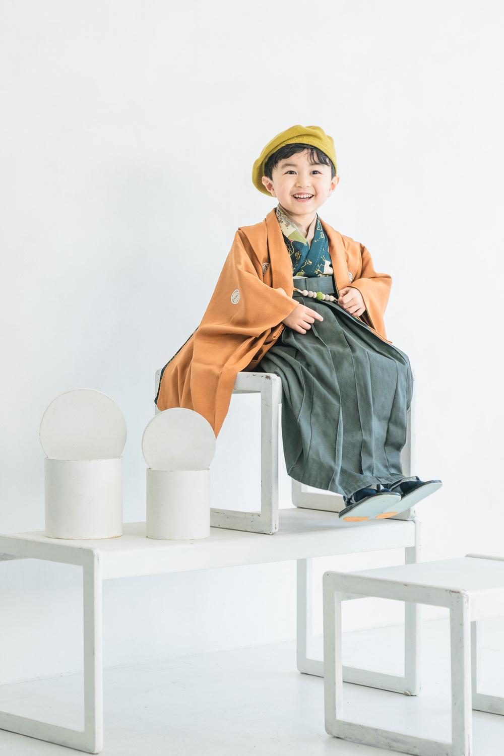 次に紹介するのは、明るい元気なお子様にピッタリの組み合わせ!中着と袴を控えめな色、デザインで統一する代わりに、羽織は思いっきり明るいオレンジカラーで!ダークカラーとビビットカラーのコントラストが可愛いコーデです◎5歳さんの持つハツラツとした元気さが表現できますよ♩