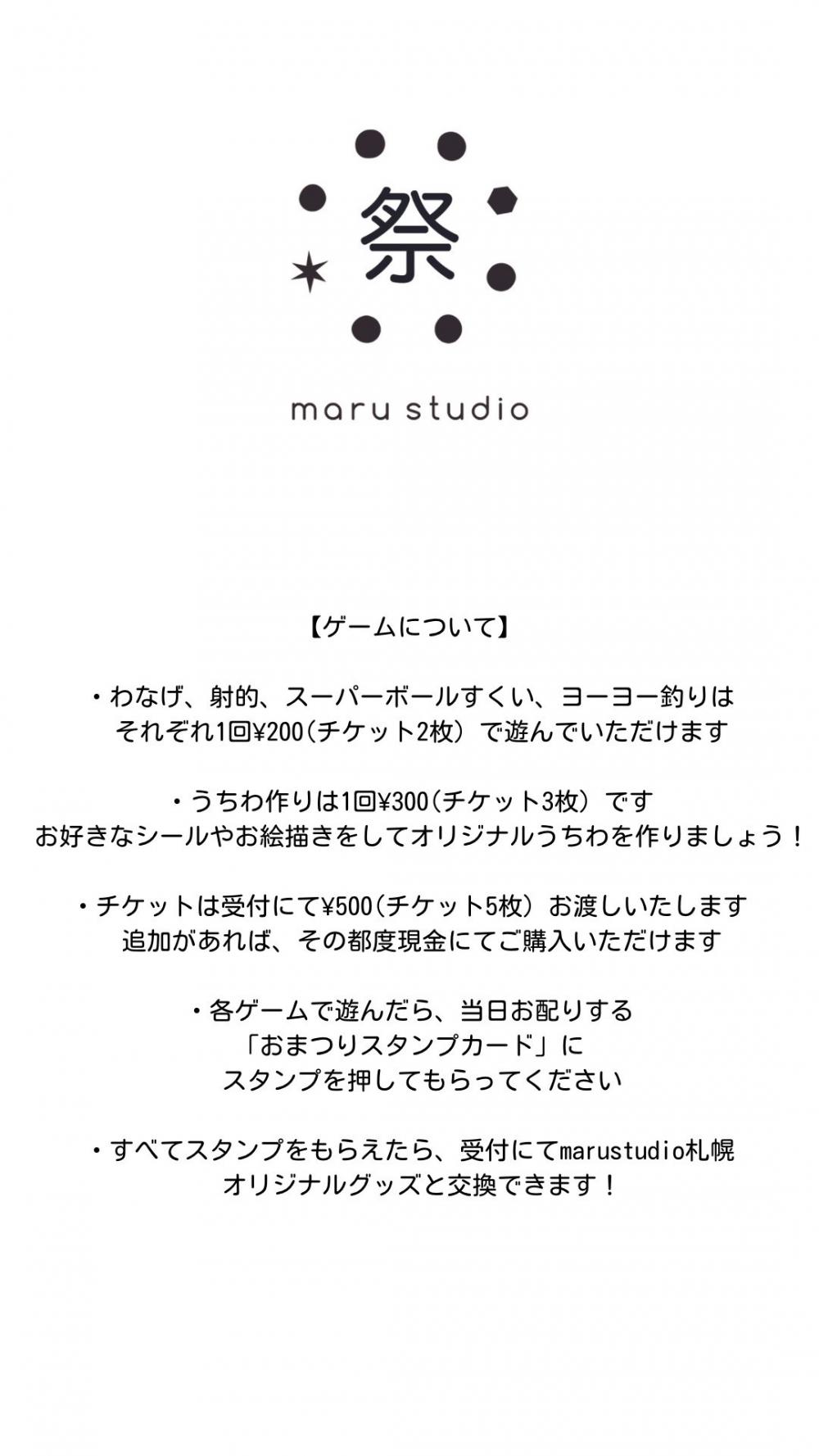 大人も子供も盛り上がれるように、“わなげ・オリジナルうちわ作り・ヨーヨー釣り・スーパーボールすくい・射的”などたくさんゲームをご用意します♩スタンプラリーをしながら、全てのゲームに参加できた方にはmarustudioオリジナルグッズをプレゼントしますのでお楽しみに〜!!!!