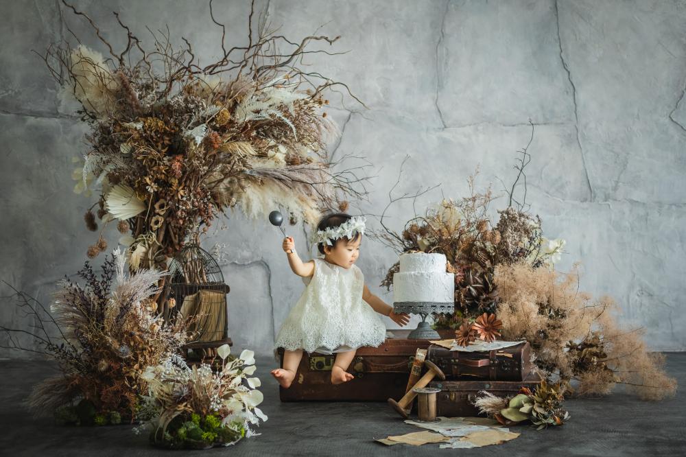 お誕生日のお祝いにはクレイケーキをセットさせていただいたり、衣装を着ておめかししながら非日常的な空間で撮影ができます◎スマッシュケーキや選び取りカード、一升餅などのお持ち込みもOK♩その一瞬を逃さず撮影させていただきます^^