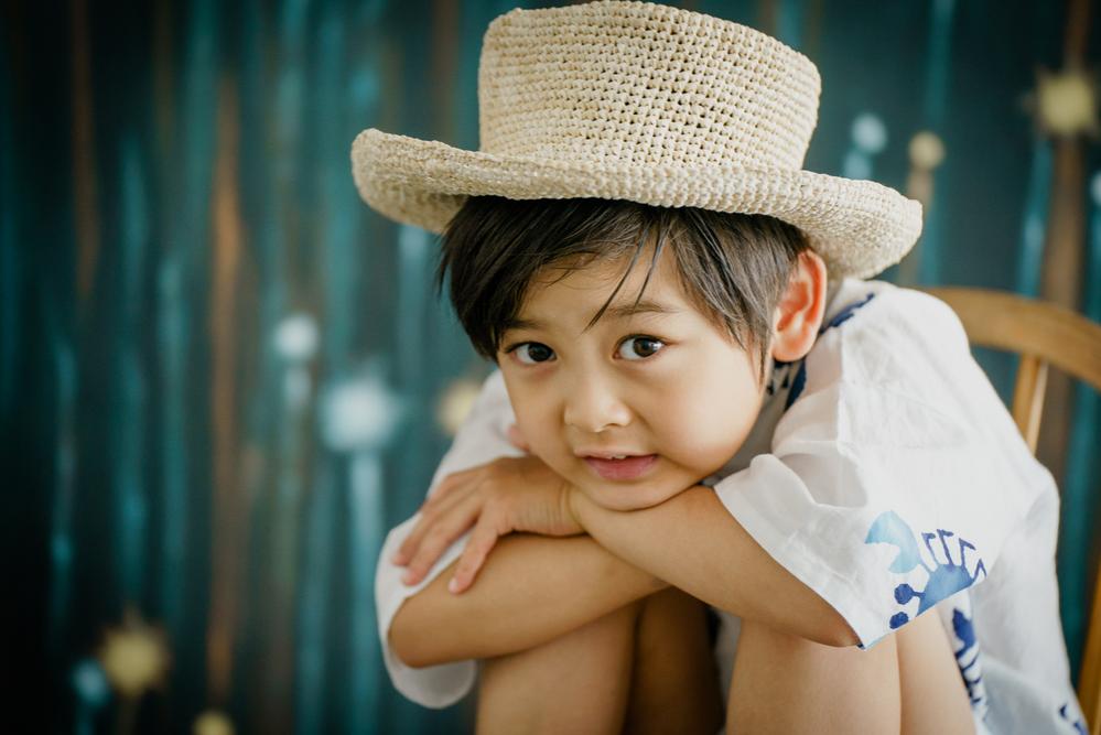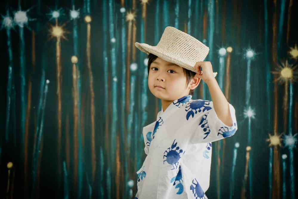 最初に来てくれたのは5歳の男の子。カニ柄の甚平を着て来てくれました。表情を作ったりポーズをとったりするのがとても上手で、かっこいい表情やポーズをたくさん見せてくれた男の子◎いろいろなポーズを撮ってもらったり帽子をかぶってもらったり椅子に座ってポーズを取ってもらったり……。現場スタッフも男の子もとてもノリノリで撮影が進み、できあがった写真もモデル撮影の時のようなかっこいいショットがたくさんでした!