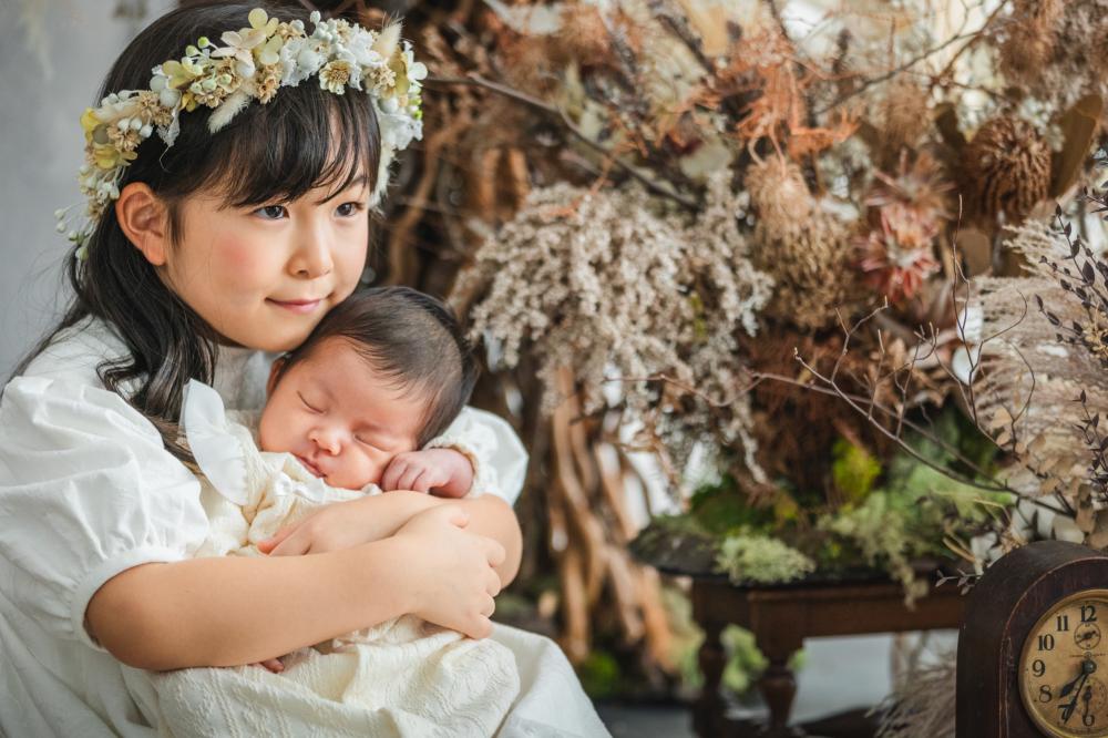 marustudio札幌では、メインのお子様だけではなく姉妹・兄弟ショットや、ご家族一緒の撮影をさせていただいております^^ 姉妹で色味やコーディネートを合わせたドレスでの撮影もとっても可愛いです♡生まれたばかりの妹ちゃんを抱きしめる姿に『小さなお母さんになったようですね〜♩』とパパママも温かく見守っています!