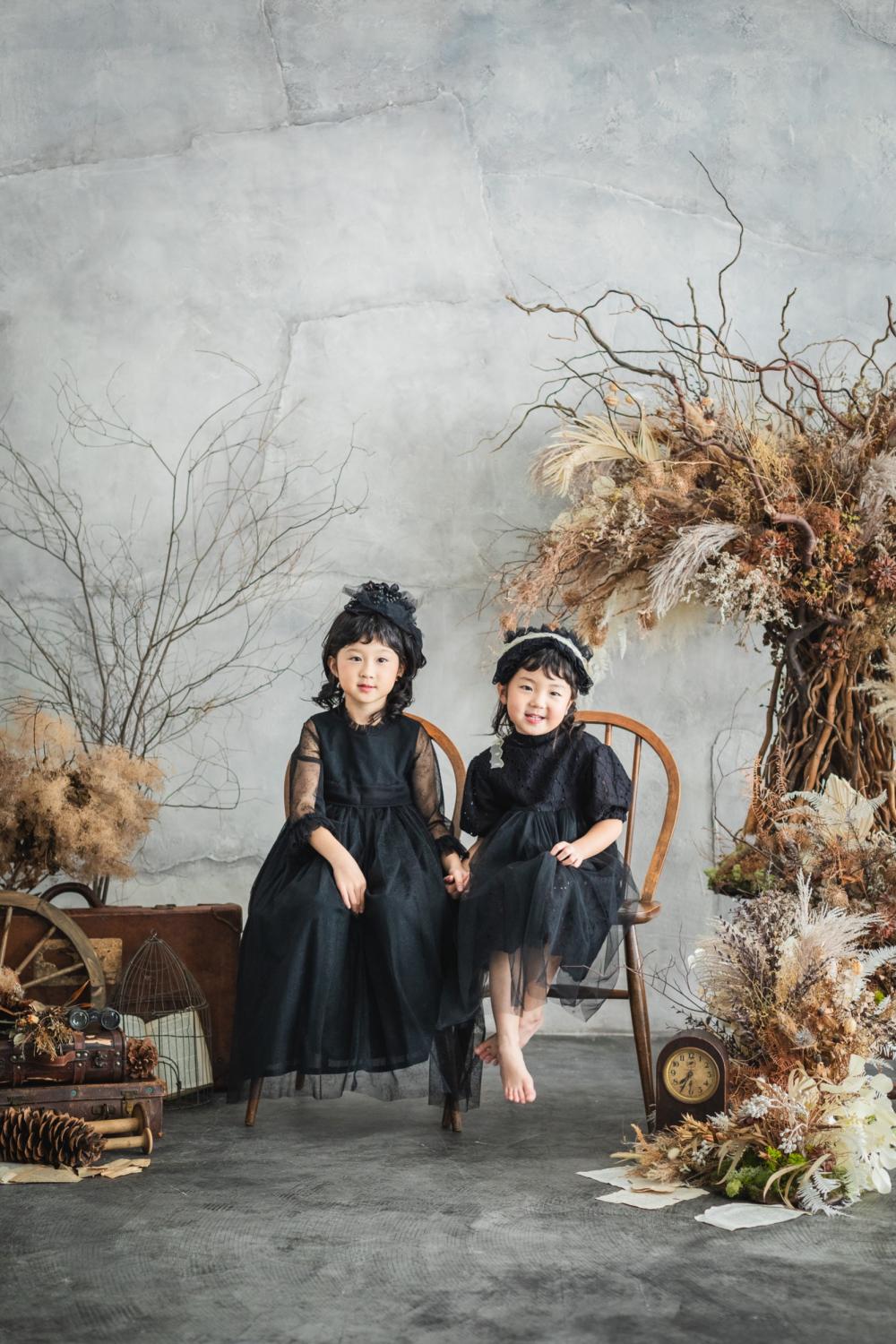 姉妹お揃いのブラックドレスもおすすめです^^♩お姉ちゃんと一緒のドレスに満足げな妹ちゃんもとっても可愛いですね♡ヘアアクセサリーなどで少しだけちがいをつけるのも素敵です!