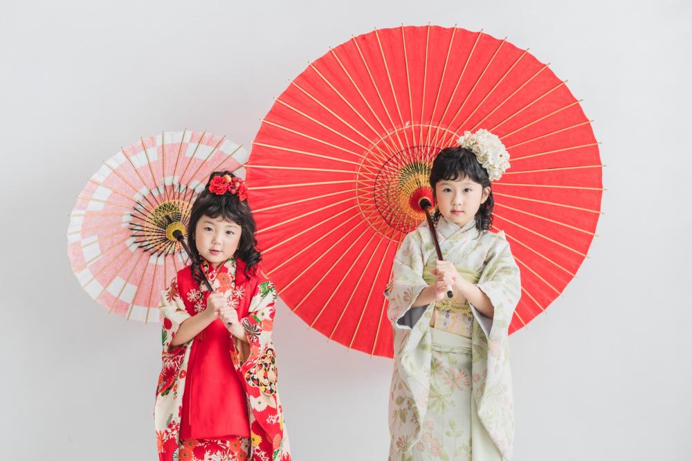 七五三のお着物にお着替えをするとまた雰囲気がガラッと変わりますね^^♩お姉ちゃんをお手本にしてしっかり傘を持つことができました♡『お姉ちゃんが大好きでいつも真似っこしてるんです!』とパパママも姉妹が楽しそうにしている姿ににっこりです♡