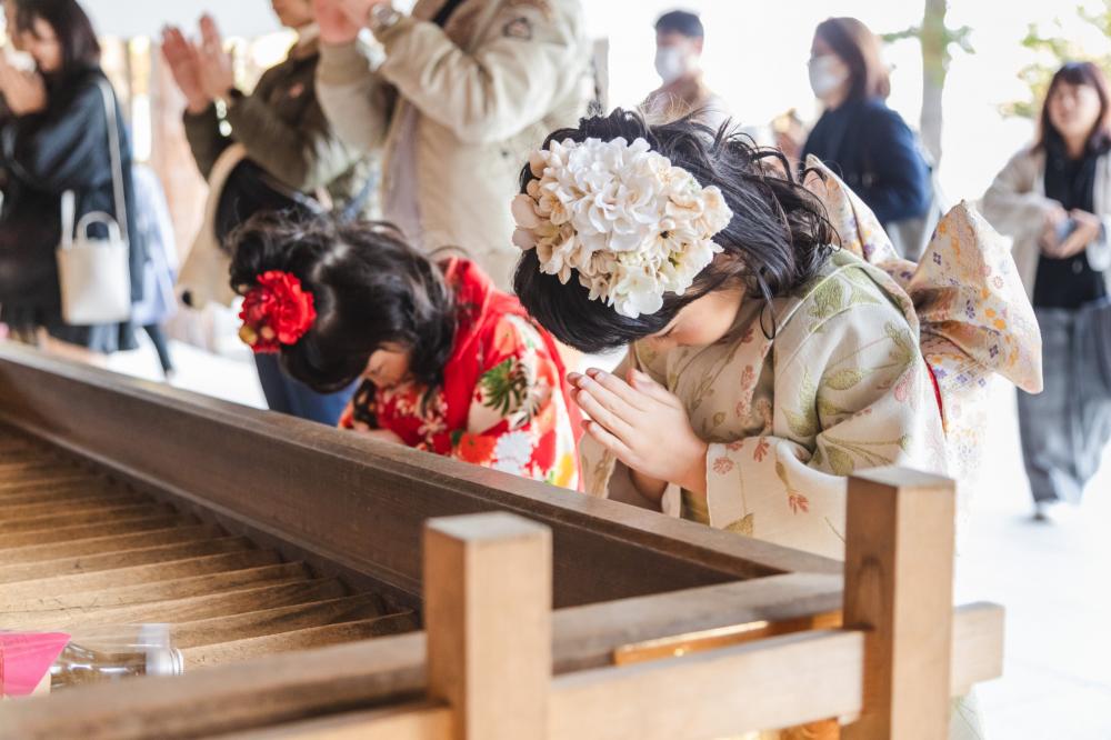 スタジオでのドレス&お着物撮影後にロケーション撮影も可能です^^みんなでご祈祷をしてお子さまの成長をお祝いしましょう♩どんなお願いしたの〜?と聞くと『ごはんをたくさん食べたいな♩』と微笑ましい回答が♡パパママも思わずにっこりです^^