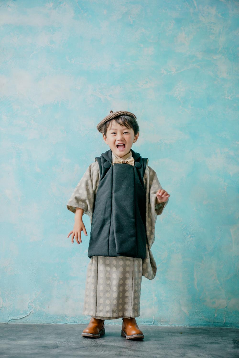 最後に紹介するのは黒地にカラフルでオリエンタルな花柄が特徴のお着物。花柄生地で、一見すると男の子には向かないデザインに見えますが、ナチュラル系な色味で落ち着いているので黒やシックな色の小物と合わせることで、かっこよくアレンジできます。黄色の被布でポップな印象にするもよし、黒いベレー帽と合わせてどこかノスタルジックなコーデにするもよし、遊び心たっぷりで着られる着物です◎ 一生に一度の3歳の七五三。素敵なお着物を着て撮影しませんか!?