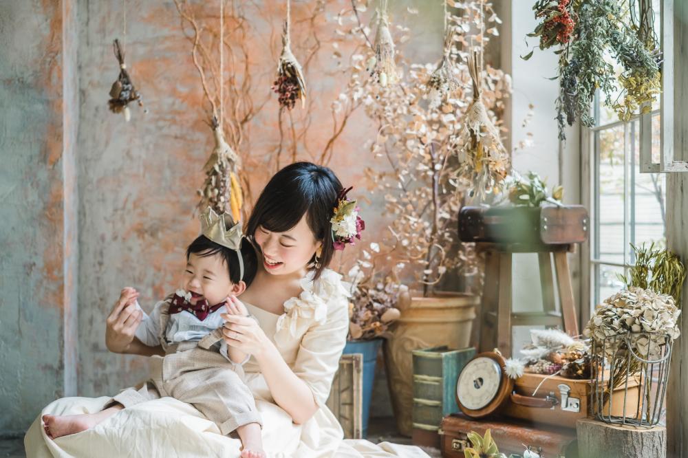 ママのお膝に座って、人気のドライフラワーのブースで撮影です♩