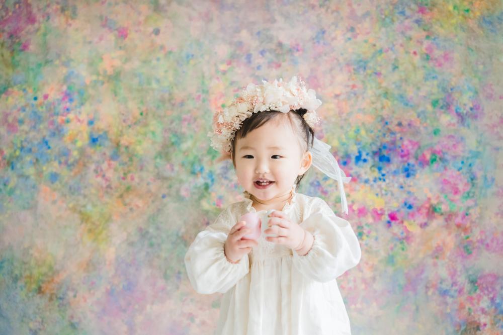お持ちこみのピンクの花かんむりと背景のピンク色がいい感じにマッチしています♡